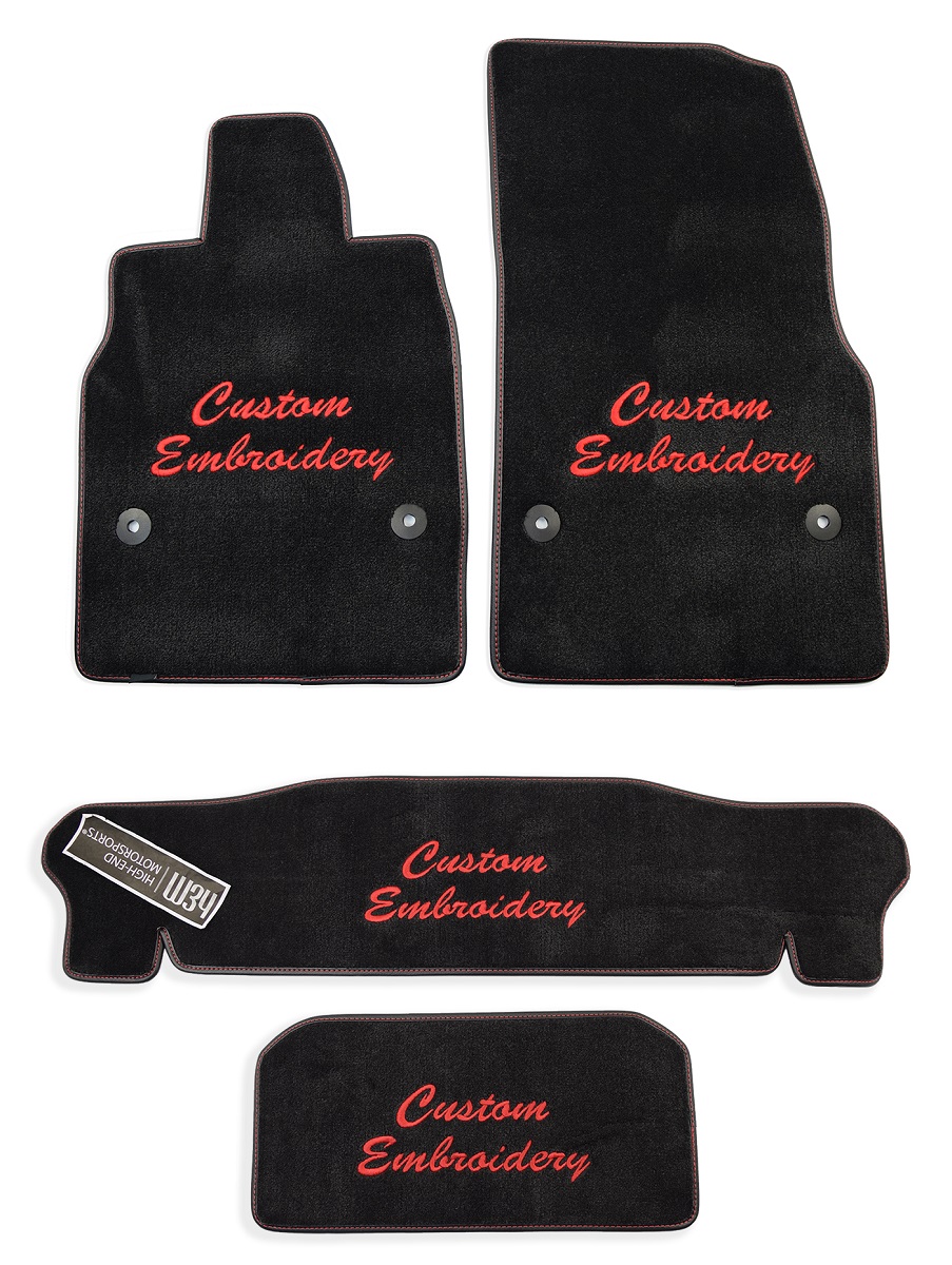 Personalized Embroidery. Personalize your mats with a name, initials or most any message. Lettering may not contain any vehicle make, model or model numbers. NO exceptions can be made. Most lettering will be between 2” and 2.5” in height and are embroidered sewn through the mat face and backing for strength and durability. Maximum spaces are 10 per line. Both front mats and optional trunk / cargo mat will have the same message centered on the mats.
