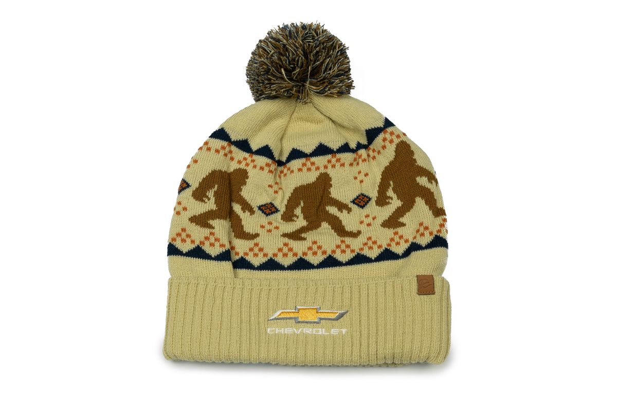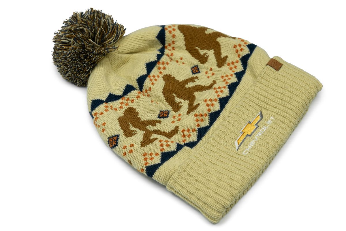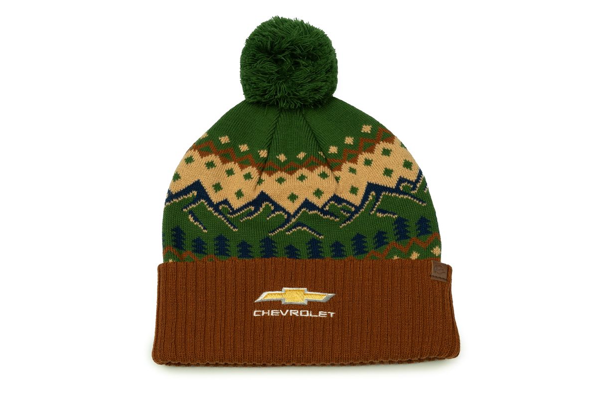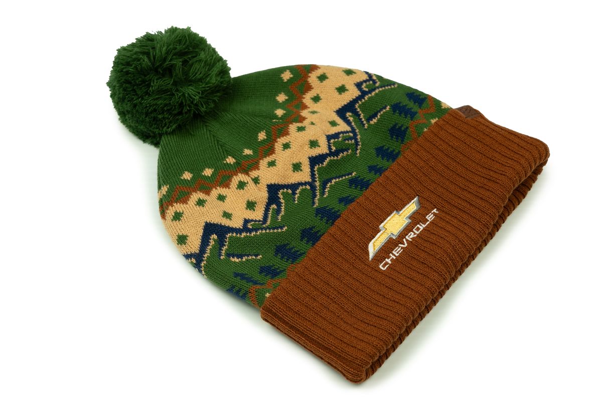 Stay warm in style with this acrylic knit Chevrolet beanie featuring a 3″ cuff, tonal pom, and an embroidered Gold Bowtie logo against a scenic view design. Perfect for Chevy fans.