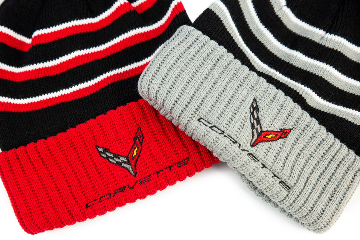 High-End Quality Official GM Licensed Corvette C8 Beanie featuring a Pompom. Nice embroidered Racing Flags and Stingray Logo, 100% Acrylic Beanie, wool like feel and appearance. A must have for your collection!