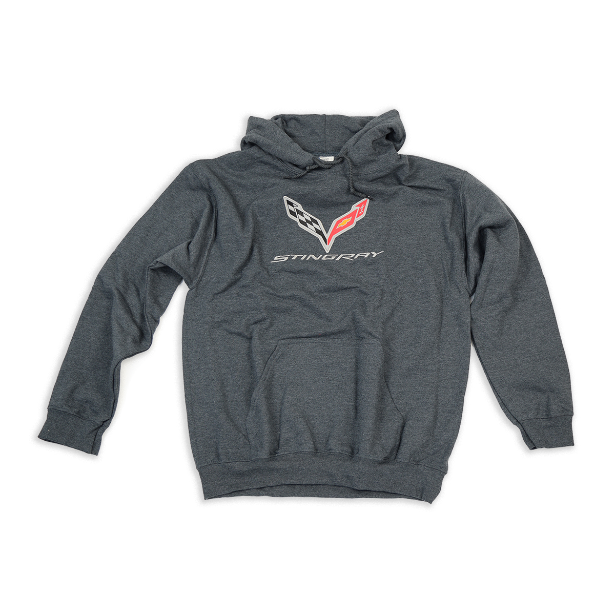 Official GM Licensed Chevrolet Stingray Hooded Sweatshirt. Ribbed cuffs and waistband, pouch pocket, fully cover-seamed. Embroidered C7 Corvette Flag & Stingray Logo. 50/50 cotton/polyester. Anyone who loves America, loves Chevrolet Corvette Logo Sweatshirt.