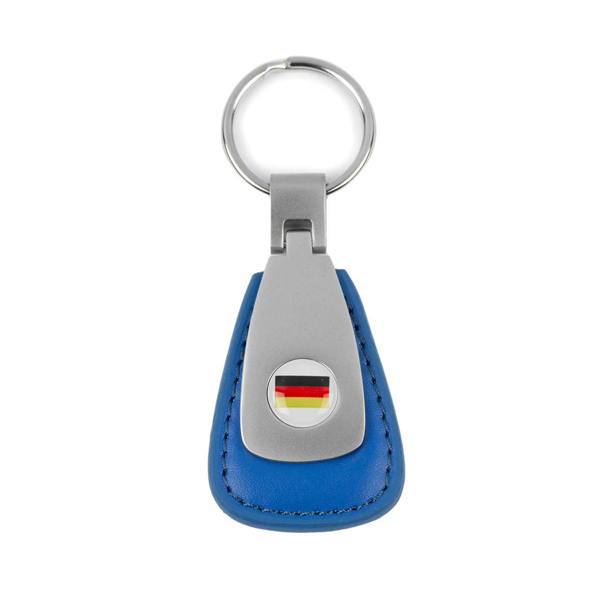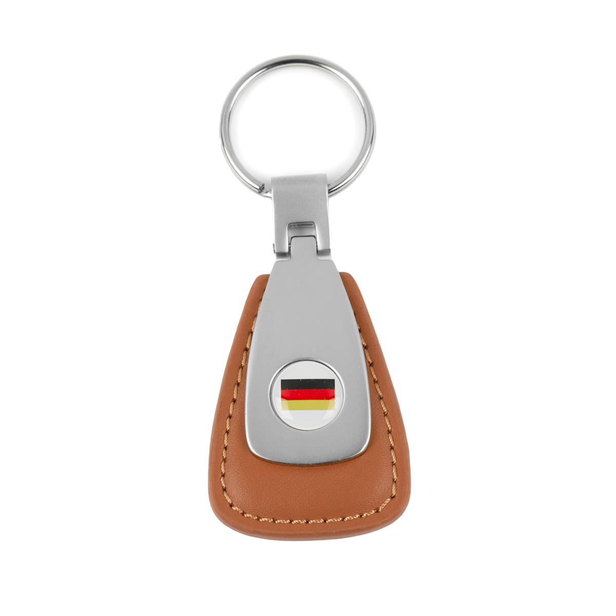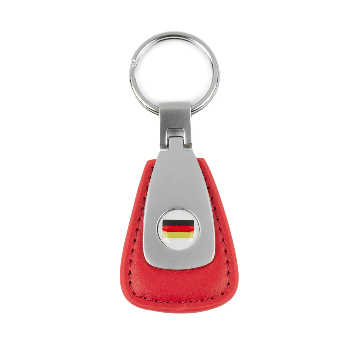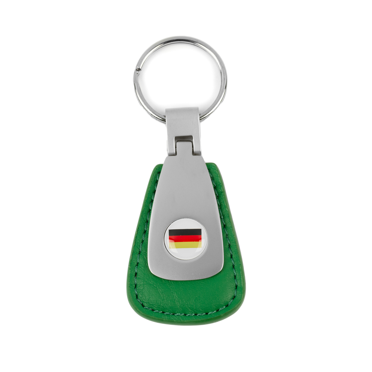 This German Flag key fob features the Classic look of a vintage leather fob with today’s lightweight brushed aluminum to give it a modern twist. Features a highly detailed German Flag raised embossed domed logo on the front.