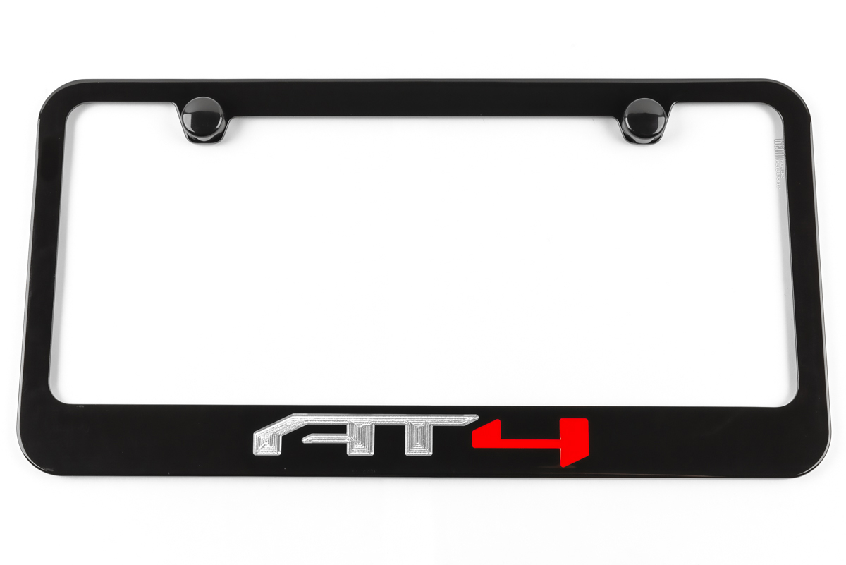 Hand-Filled with UV stable epoxy Paint , our frames boast vibrant colors that resist fading. The logos are hand filled with your choice of color in Black, Red or Clear exposing Silver Zamak to name a few. The result is a stunning, long-lasting finish that enhances the aesthetics of your GMC AT4 .