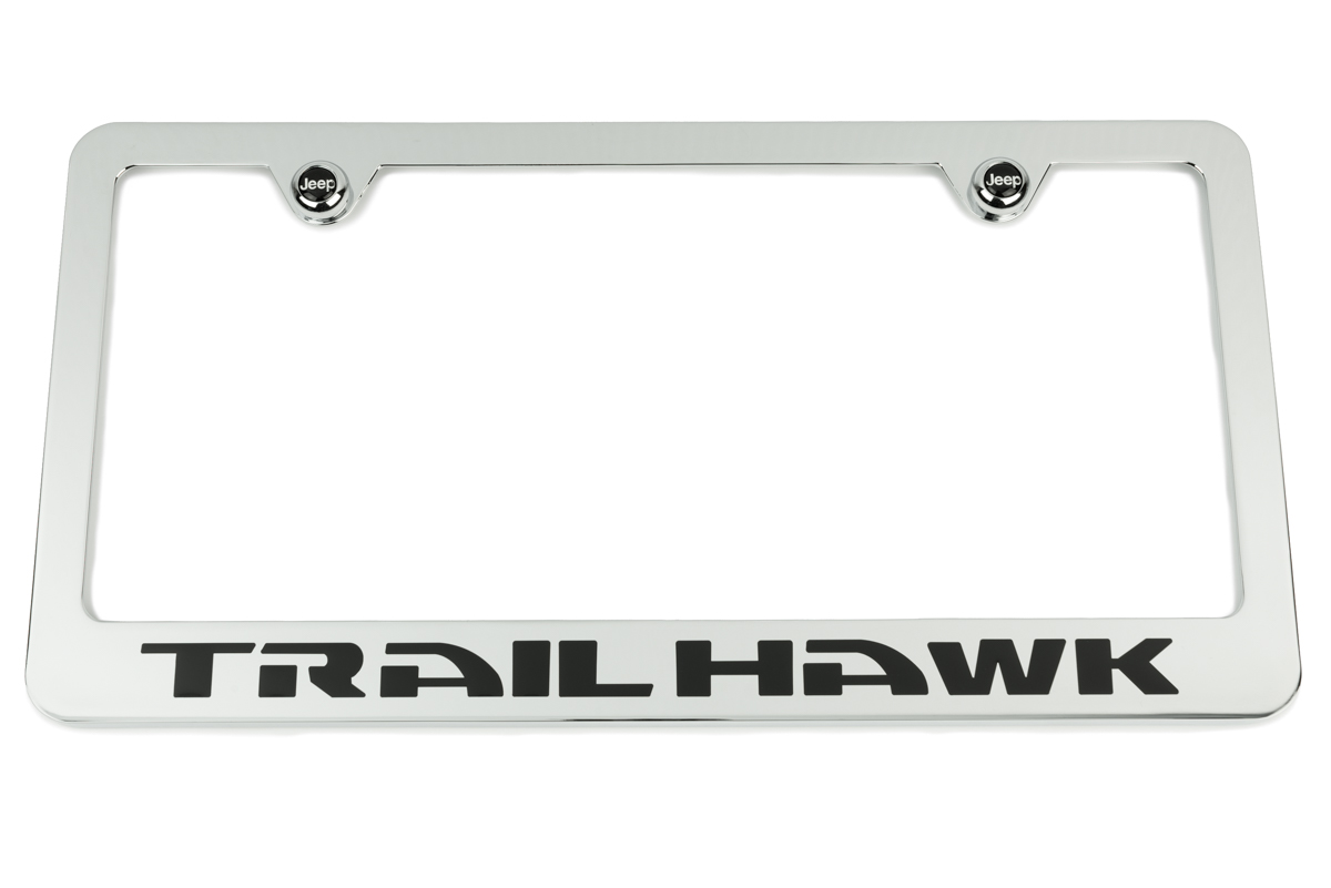 Jeep Trailhawk Chrome Plated License Plate Frame with a pair of matching Snap Caps and Fastener Kit.