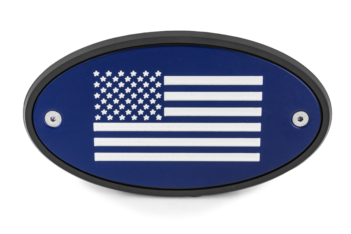 American Flag Satin Blue Receiver Hitch Plug Cover. Made in the USA