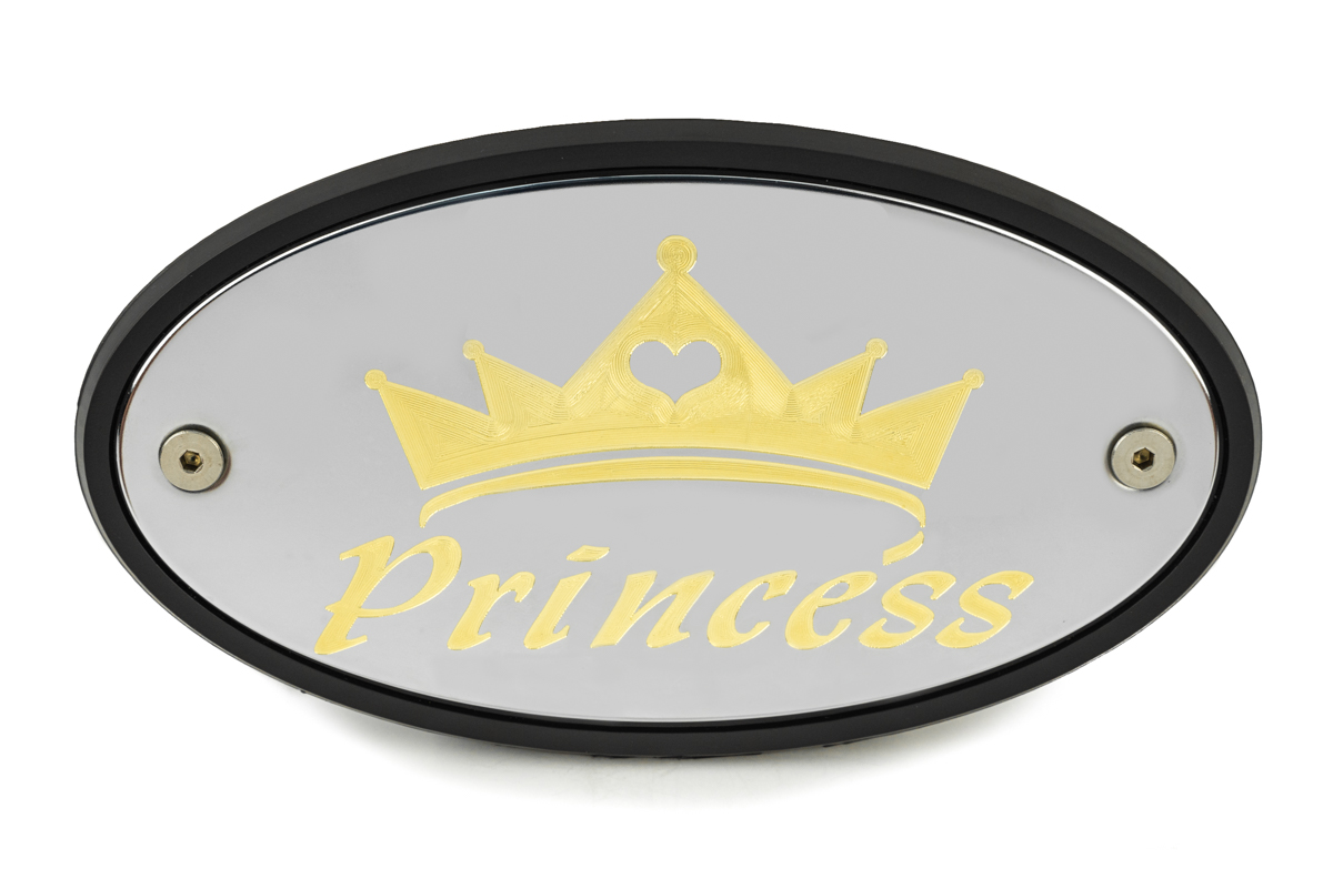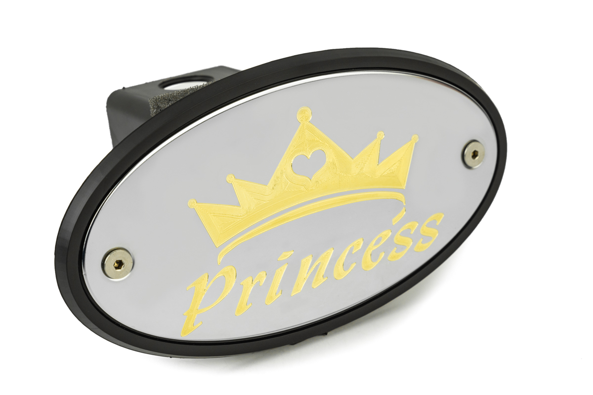 Go ahead, proudly install this "Princess" Receiver Hitch Plug Cover that is made from a tough ABS plastic so it will not vibrate (Setting off your engine knock sensor, causing loss in power). Receiver can be installed with or with-out your locking pin. Features a Solid Brass, High Polished Chrome Finished Hand Engraved Logo, Epoxy filled Resin (Not Paint) then baked overnight to give you years of service that a vehicle should have.