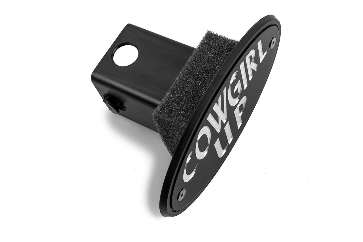 Cowgirl Up Satin Black Receiver Hitch Plug Cover. Made in the USA