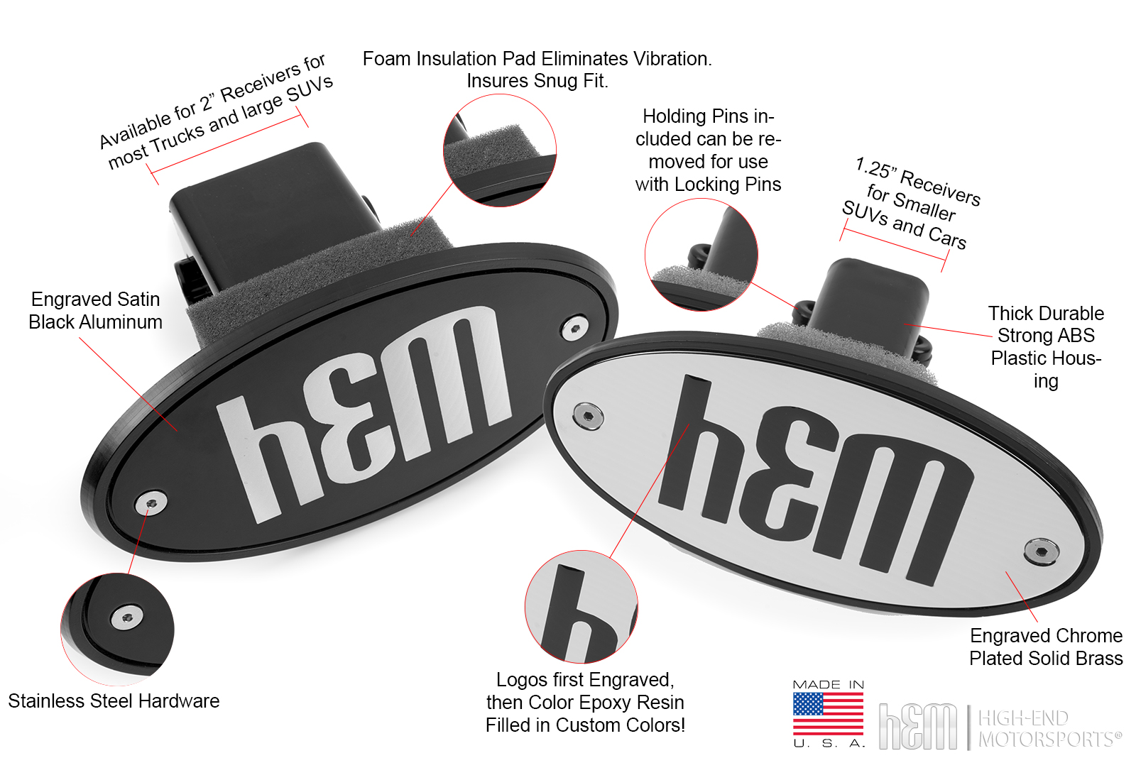 Go ahead, proudly install this Custom "Laguna Seca" Receiver Hitch Plug Cover that is made from a tough ABS plastic so it will not vibrate (Setting off your engine knock sensor, causing loss in power). Receiver can be installed with or with-out your locking pin. Features a High Quality Satin Black, Blue or Red Finish Aluminum, Hand Engraved Logo, Epoxy filled Resin (Not Paint) in your choice of color then baked overnight to give you years of service that a vehicle should have.