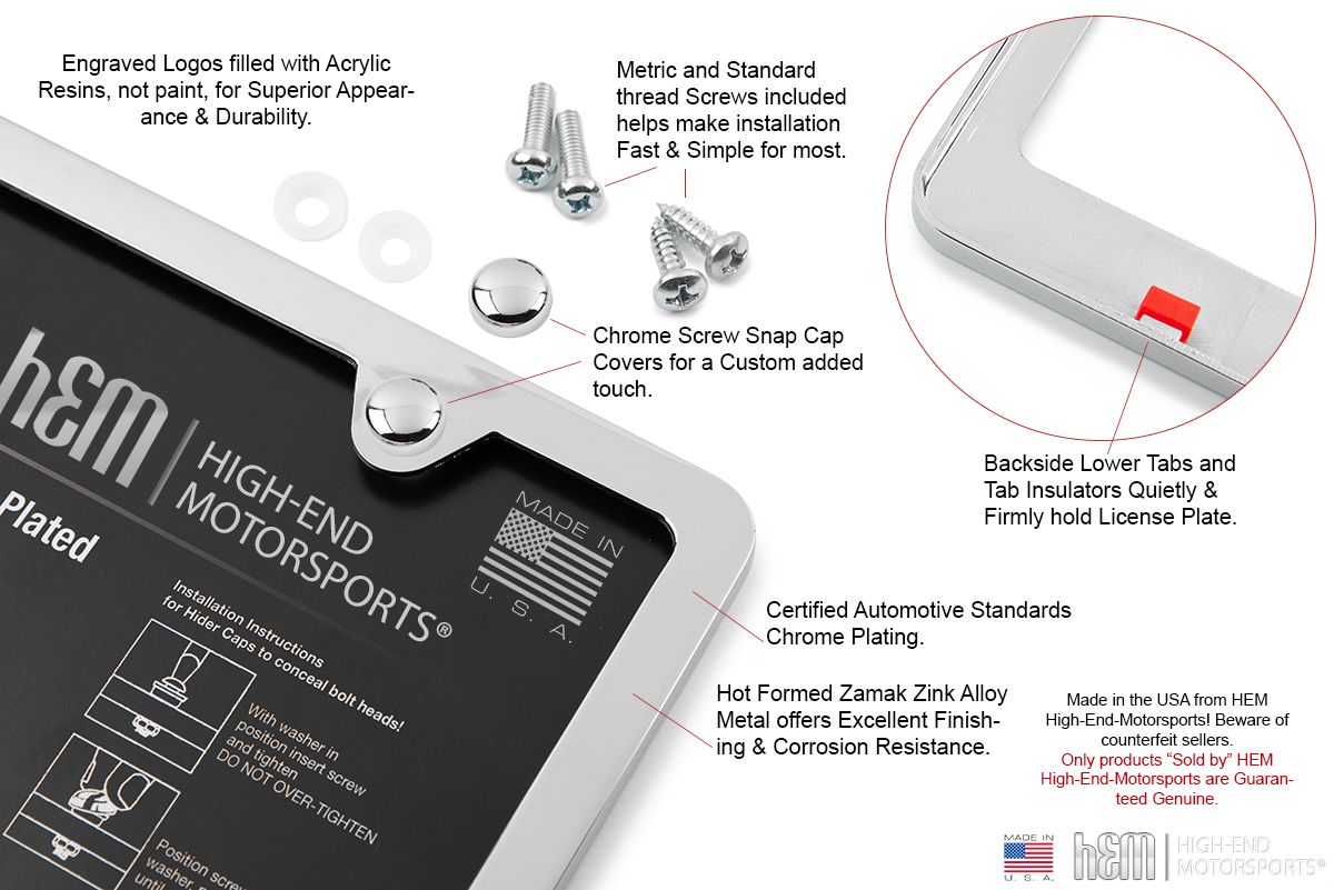 Made in the USA – High-End Quality Plated License Plate Frame, in your choice of Chrome, Black or Gold. Frame includes a pair of Snap Caps and a universal fastener kit.